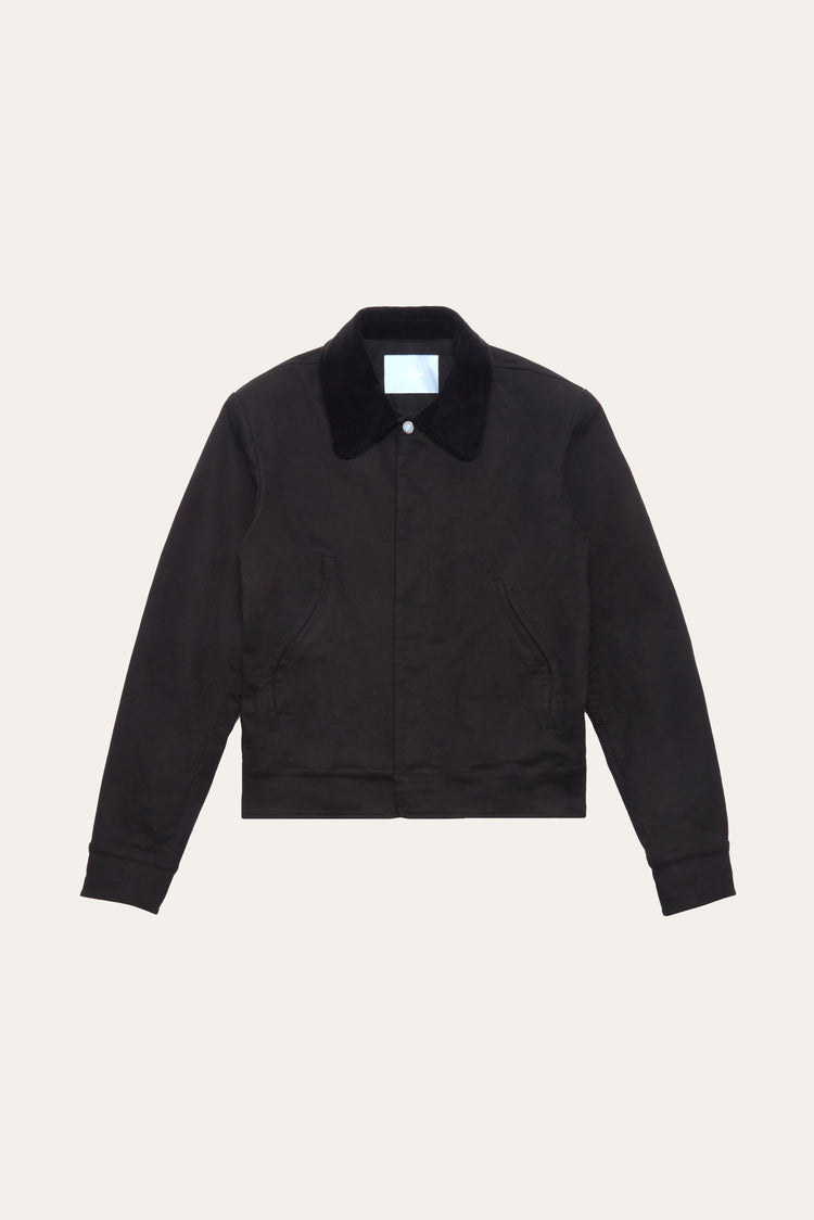 Crafted in black cotton and fully lined, it features a contrasting corduroy collar and a distinctive wavy pocket flap, small gestures that bring character and intention to the piece.