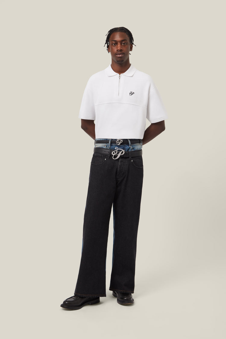 The Double Waist Denim Jeans offer a bold, two-tone design with black at the front and washed blue at the back, creating a striking contrast for a standout look. With a baggy fit and double waist bi-fabric construction, these jeans deliver a relaxed, contemporary silhouette while maintaining a unique, layered aesthetic. Featuring seven-pocket styling, a zip-fly, and dove rivets, they combine functional details with distinctive artistry for an elevated take on classic denim.