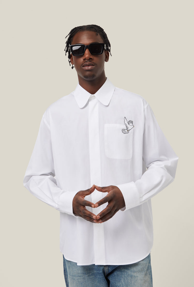 The Dove Embroidered Button Shirt offers an oversized fit, combining relaxed comfort with refined details. Featuring a hidden button closure, round-edged collar, and a discreet breast pocket, it exudes effortless style, while the embroidered Dove at the chest adds a symbolic, subtle touch. Finished with button barrel cuffs, the Dove Embroidered Button Shirt is a perfect balance of classic craftsmanship and contemporary design.