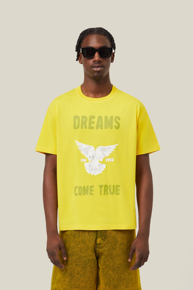 The DCT "Dreams Come True" T-Shirt offers a boxy fit made from soft cotton jersey fabric, delivering both comfort and style. Featuring bold printed artwork and intricate embroidered details at the front, it carries a powerful message with a refined touch. A perfect blend of bold expression and effortless wear, the DCT "Dreams Come True" T-Shirt is a reminder that anything is possible