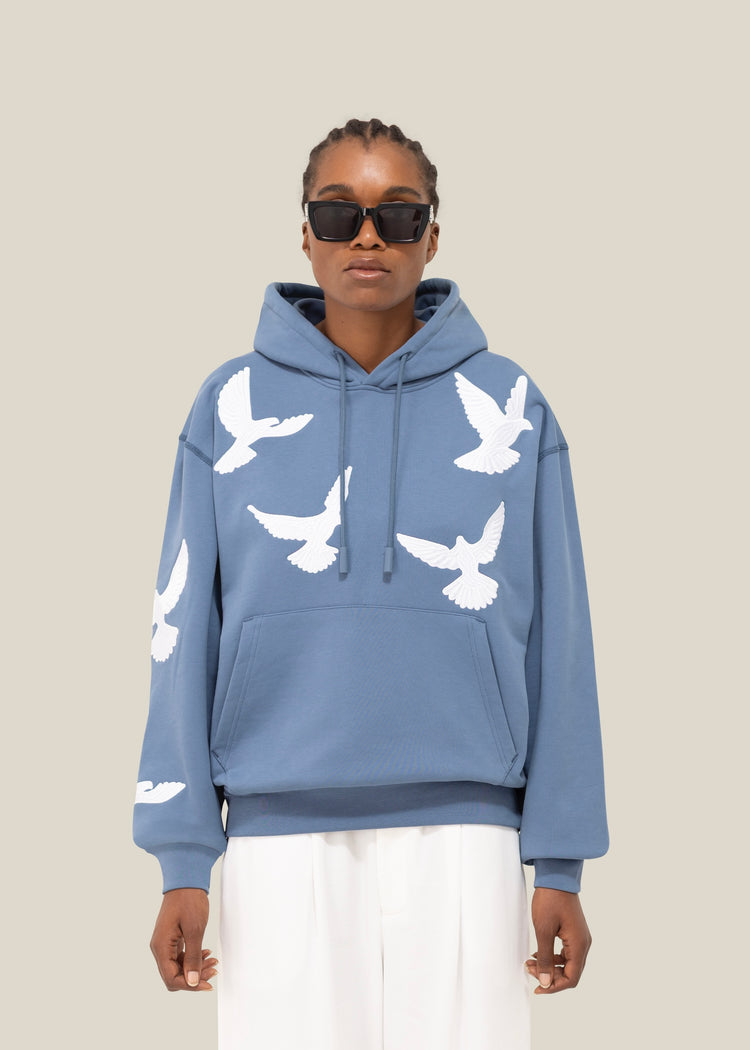 The Flying Doves Hooded Sweater captures the poetic essence of 3.PARADIS through its signature embroidered motif, a symbol of hope and freedom in motion.