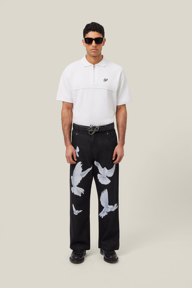 The Freedom Doves Denim by 3.Paradis features a baggy fit with five-pocket styling and a zip-fly closure, offering a relaxed yet refined silhouette. Printed Freedom Doves and dove-shaped rivets bring a rebellious, symbolic touch to the classic denim design. Designed for the individual who dares to break free, the Freedom Doves Denim is a testament to both refined artistry and untamed freedom.