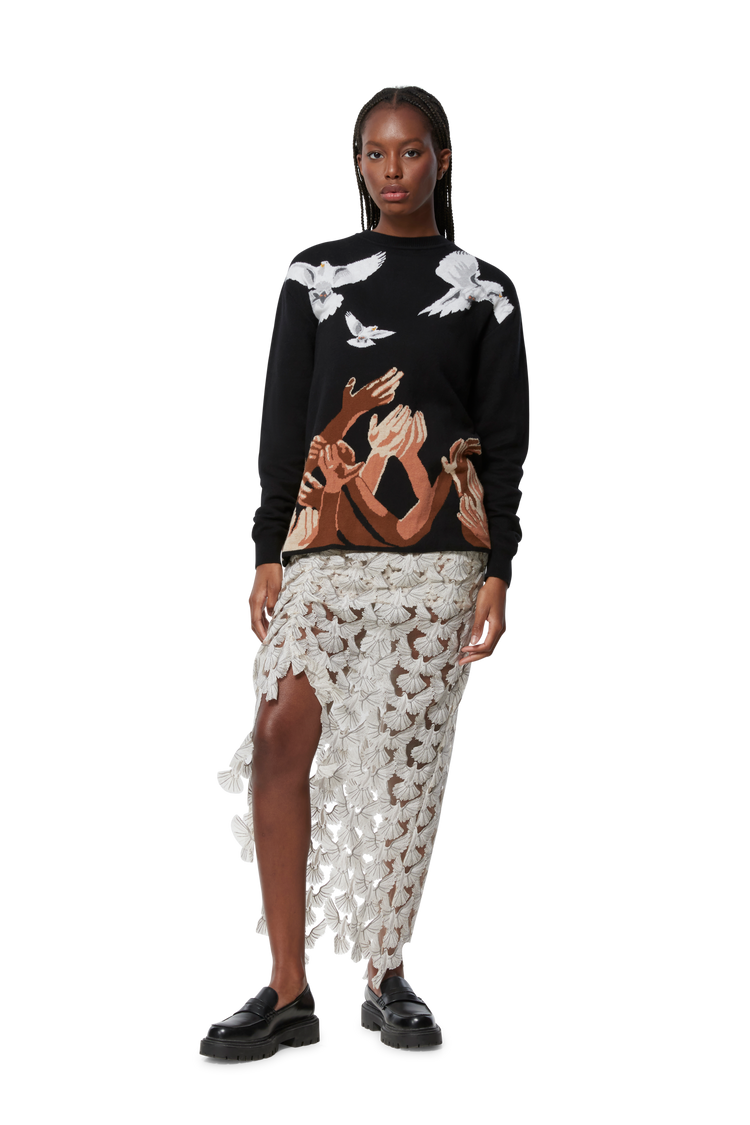 3.PARADIS most powerful messaging is displayed on this lightweight HBC black knit crewneck. The bold intarsia knit artwork features multiple hands, with the motion of both releasing and then grasping for a flying bird, which is used as a metaphor to translate the idea of freedom & unity.
