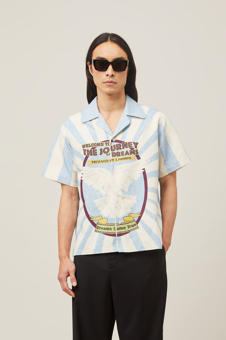The Journey of Dreams short sleeve button shirt is crafted from durable Rip Stop cotton fabric, offering a straight fit for a modern yet relaxed silhouette. Featuring a round-edged collar and hidden button closure, it maintains a sleek, clean aesthetic, while the all-over print adds a bold, playful touch. Designed for effortless style, the Journey of Dreams shirt blends utility and visual appeal in one statement piece.