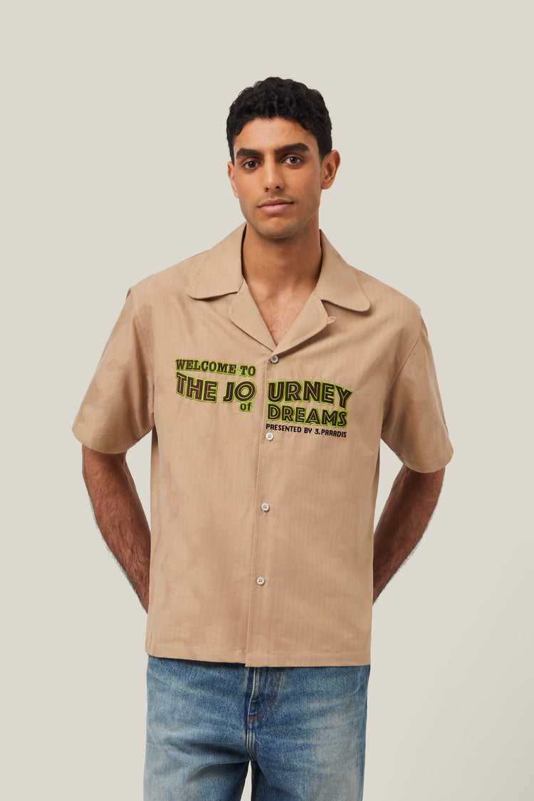 The Journey of Dreams short sleeve button shirt is crafted from durable Rip Stop cotton fabric, offering a straight fit for a modern yet relaxed silhouette. Featuring a round-edged collar and hidden button closure, it maintains a sleek, clean aesthetic, while the all-over print adds a bold, playful touch. Designed for effortless style, the Journey of Dreams shirt blends utility and visual appeal in one statement piece.