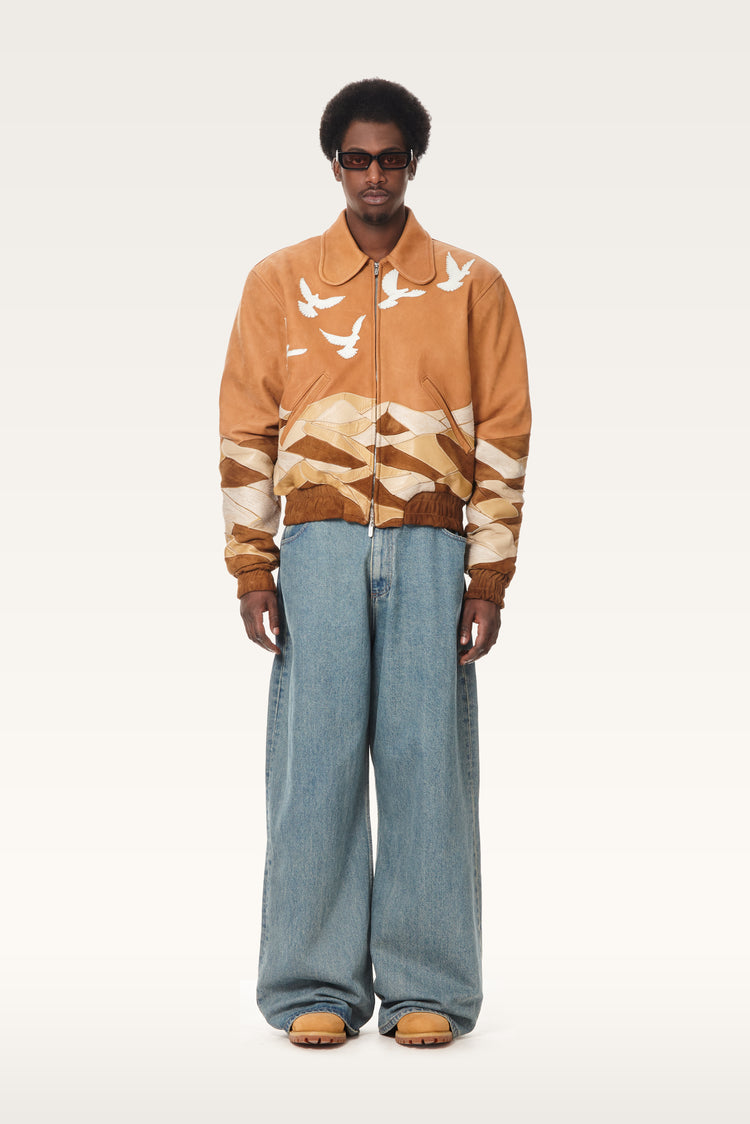 Developed in the atelier and fully lined, the jacket features hand-applied patchwork and chain-stitch embroidery depicting a sand dune landscape, finished with the words “We Are Travelers” as a quiet manifesto. An airbrushed gradient sunset across the back panel adds depth and emotion, bringing the desert narrative to life through color and texture.