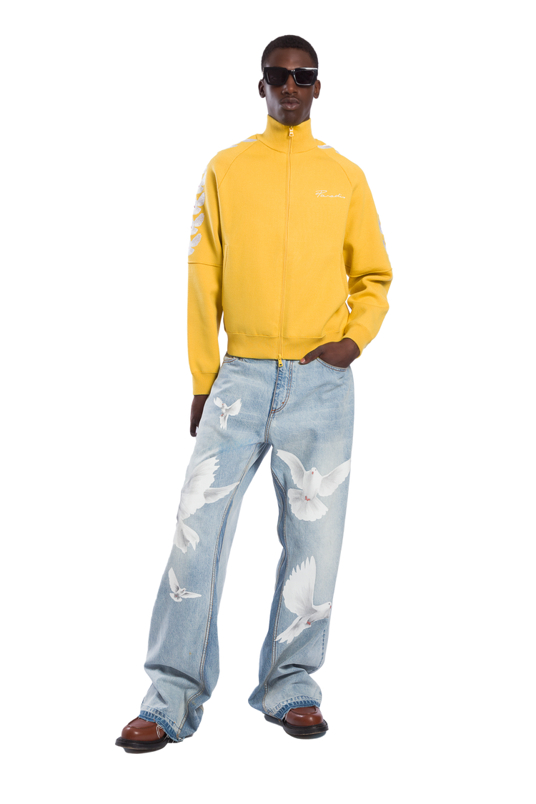 3.PARADIS' mix of contemporary design and vintage sportswear influence is on display with the Palmer track jacket. The classic bird eye knit construction is inspired by tracksuits from the 90's while the 'Unity Doves' embroidery represents the evolution of a classic vintage staple with present day design details.
