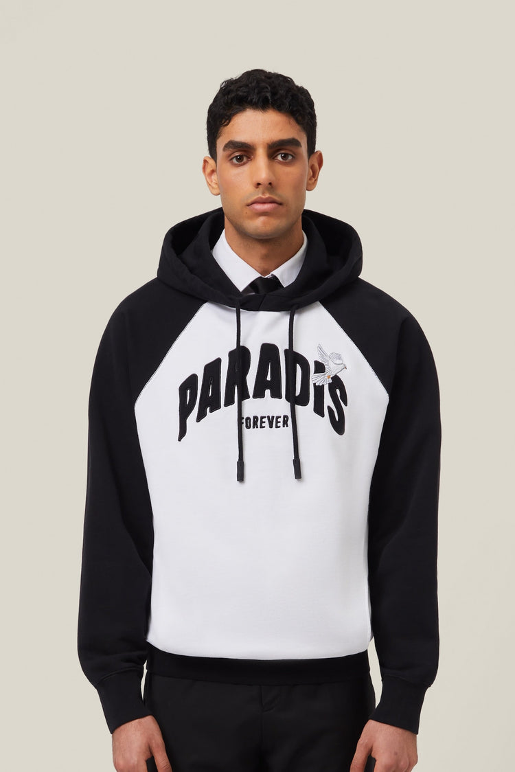 The PARADIS Raglan Hooded Sweater offers a relaxed fit, crafted from soft French terry fabric for ultimate comfort and a laid-back style. Featuring raglan sleeves, a fixed hood with a drawstring, and rib knit cuffs and hem, it combines practicality with a sleek, modern silhouette. Finished with printed artwork and embroidered details, this hooded sweater adds a refined, artistic touch to your everyday essentials.