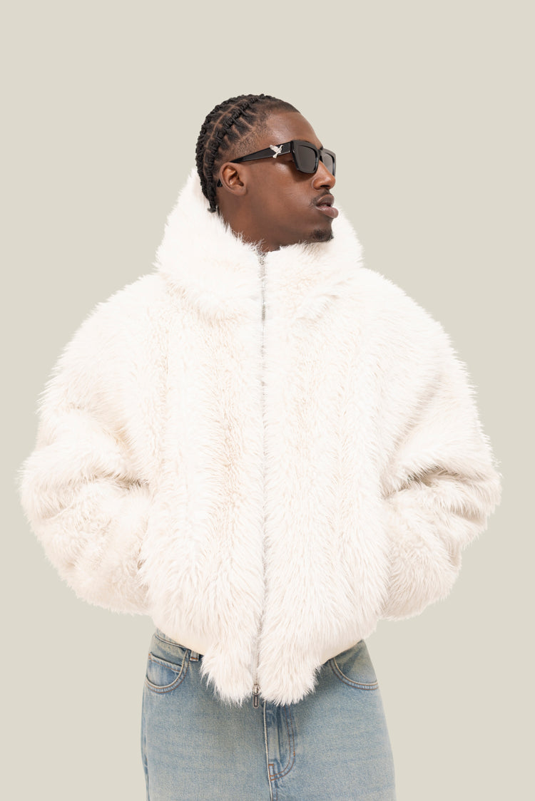 The White Fur Jacket is crafted from luxurious yak fur, offering natural warmth with an exceptionally soft hand feel.