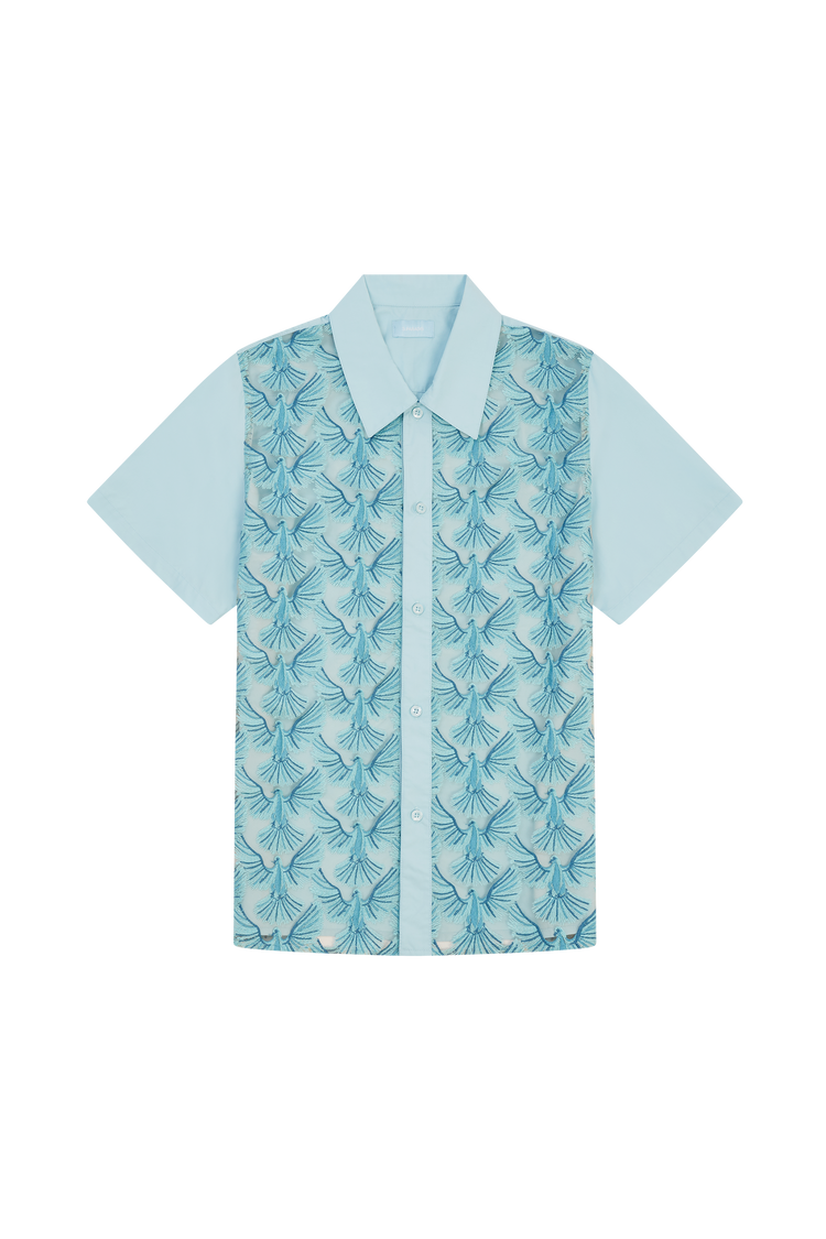 • Sky blue short sleeve shirt in birds all over embroidery tulle fabric