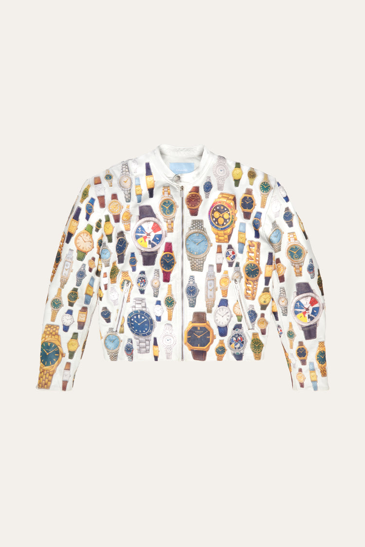 Constructed as a classic motorcycle silhouette, the jacket is embellished with handstitched leather watch patchwork, each element evoking the passage of time and the beauty of moments preserved.