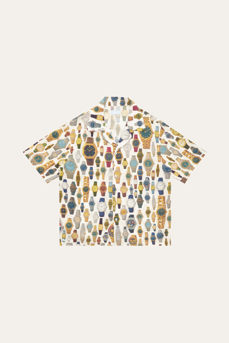 Crafted in cotton with a bowling collar and boxy fit, the design features an all-over watches print that feels graphic yet restrained. A back pleat and softly curved hem add fluidity and movement, bringing ease to a classic button-front style.