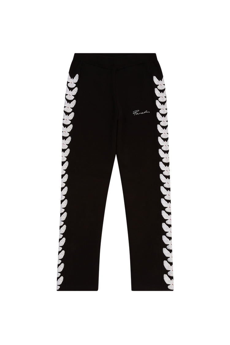 With our newly introduced staple, the 'Doves in Unity' black embroidered track pants are reintroduced in a more casual imported cotton fabric. Color blocked with black and white accents while featuring our Paradis hand autographed embroidered logo, these side panel dove embroidered track pants represents the evolution of a popular past item with present day design details. All while advancing 3.PARADIS' mission to share with the world our inspiration of freedom through unity.